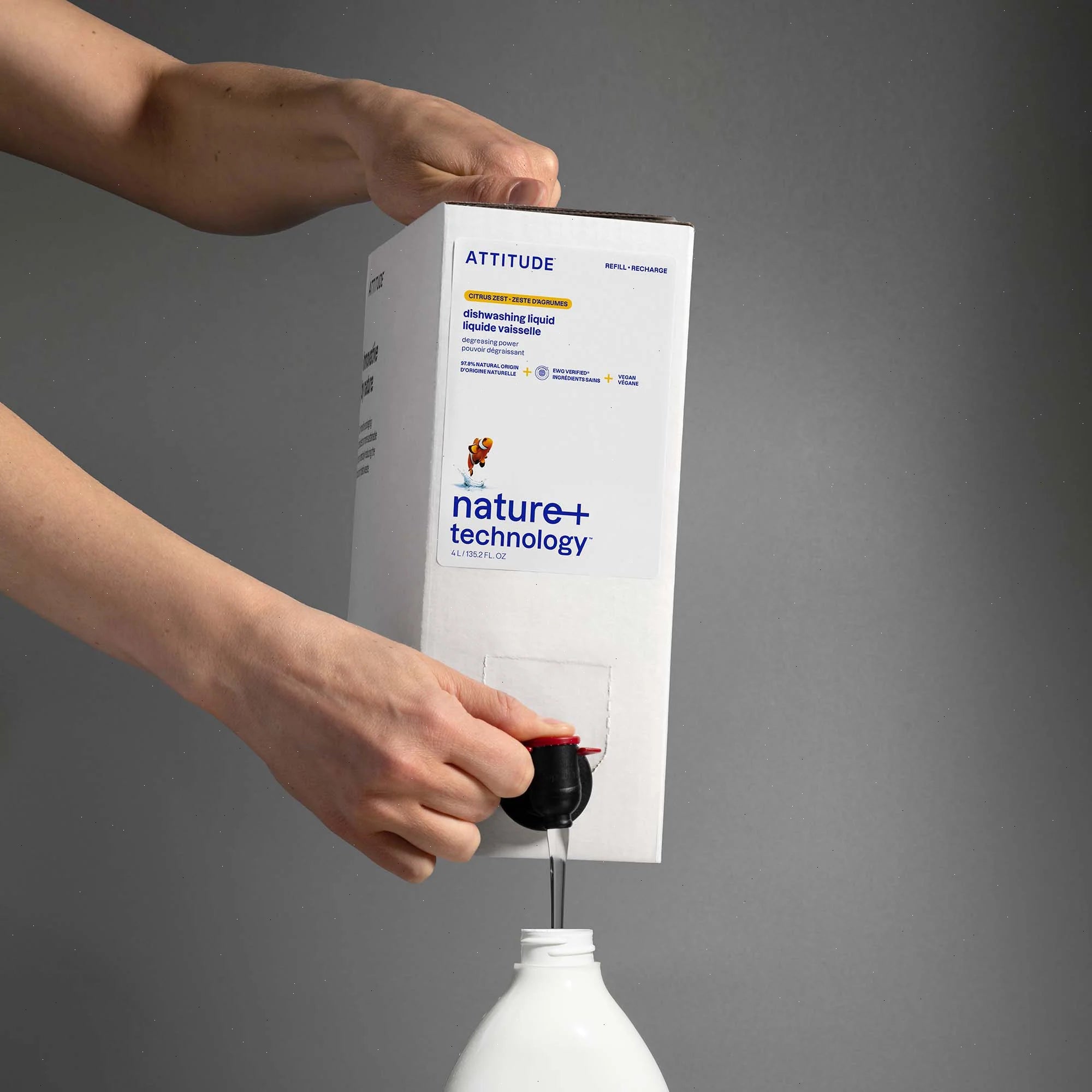 Formulated with 97% naturally derived ingredients, ATTITUDE™ dishwashing liquid with strong degreasing power is your new home essential. Its aromatic blend of coriander and olives evokes the scent of fresh herbs and creates a Mediterranean ambiance. Never run out of dishwashing liquid—keep refilling your bottle thanks to our innovative eco-refills. Its EWG VERIFIED™, vegan and cruelty-free formula leaves your dishes clean and sparkling every day.