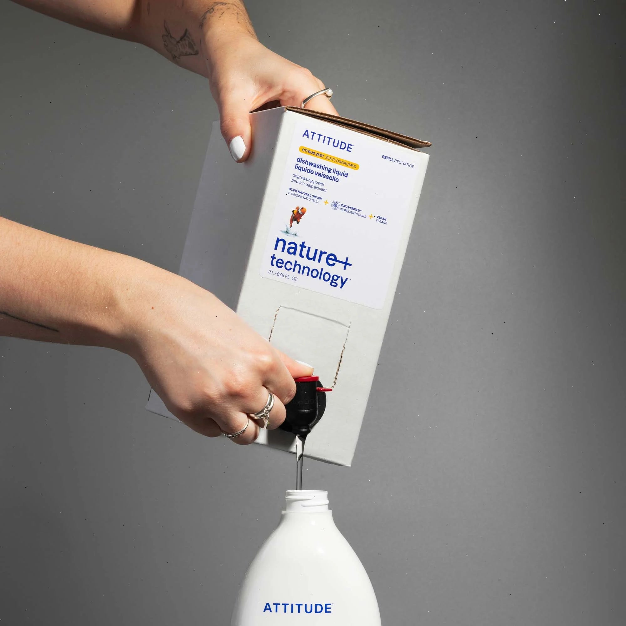 Formulated with 97% naturally derived ingredients, ATTITUDE™ unscented dishwashing liquid with strong degreasing power is your new home essential. It comes in a bottle made from HDPE #2 plastic—the easiest plastic to recycle. Its formula is EWG VERIFIED™ and vegan. This dishwashing liquid is offered in a 2L eco-refill format that’s easy to carry and use at home.