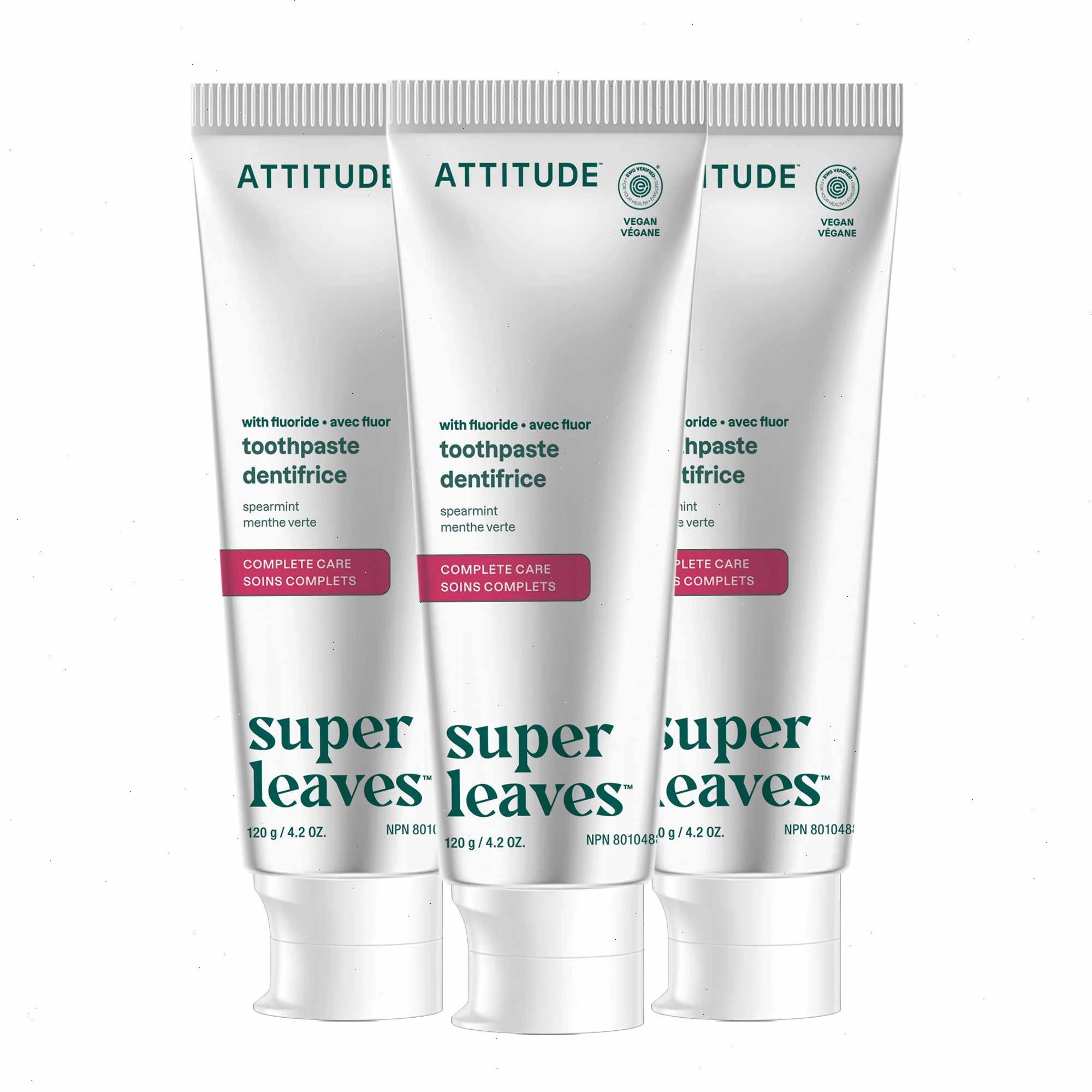 Take care of your smile from teeth to gums with ATTITUDE Complete Care Adult Toothpaste with Fluoride. Its natural and effective plant- and mineral-based formula contains fluoride to protect your teeth from cavities and hydrated silica, a natural whitening agent. This vegan, cruelty-free toothpaste also helps restore and remineralize enamel for stronger, healthier teeth. Take charge of your oral hygiene with the help of our toothpaste which contains papaya and green tea leaf extracts and helps make your teeth whiter and stronger, while eliminating bad breath. You'll love its refreshing natural spearmint flavor!